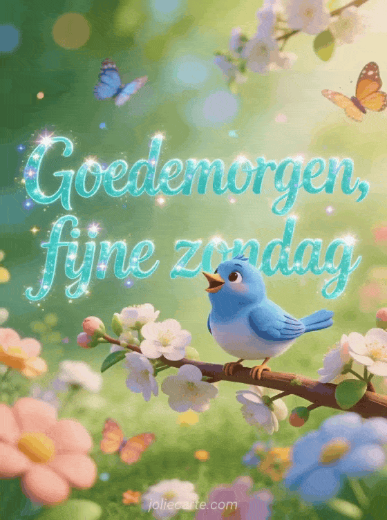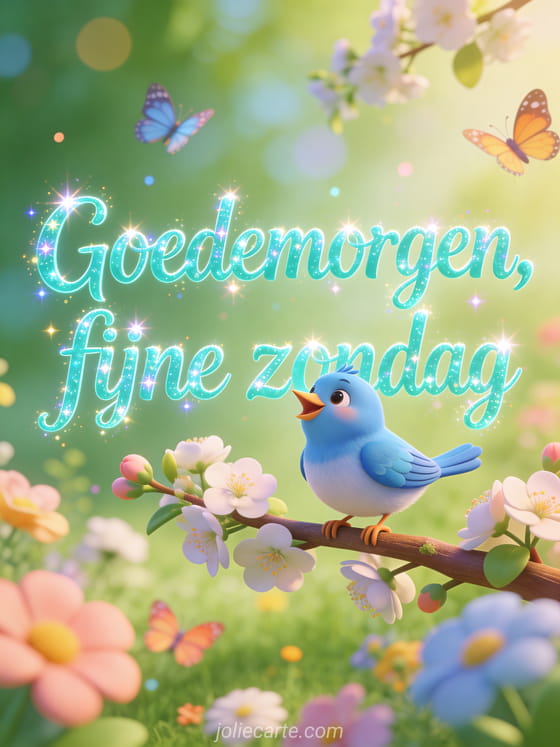 Deel een heldere zondagmorgengroet met een schattige mees die zingt op een bloeiende tak, lentebloemen en dansende vlinders. Je kunt ook fijne zondag en fijne dag of fijne zondag rust sturen.