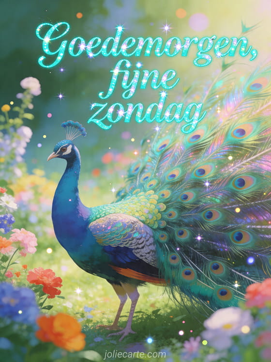 Wens een schitterende zondag met deze kleurrijke kaart waarop een prachtige pauw zijn indrukwekkende staart opent in een tuin vol bloemen. Ontdek ook fijne zondag regen, fijne zondag gratis afbeelding of gezegende zondag.