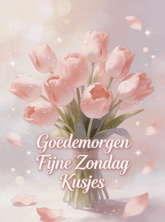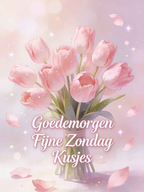 Stuur een romantische goedemorgen fijne zondag kusjes wens met een prachtig boeket roze tulpen met ochtenddruppels. Ontdek ook een fijne zonnige zondag kaart of een hoi fijne zondag kusjes kaart.