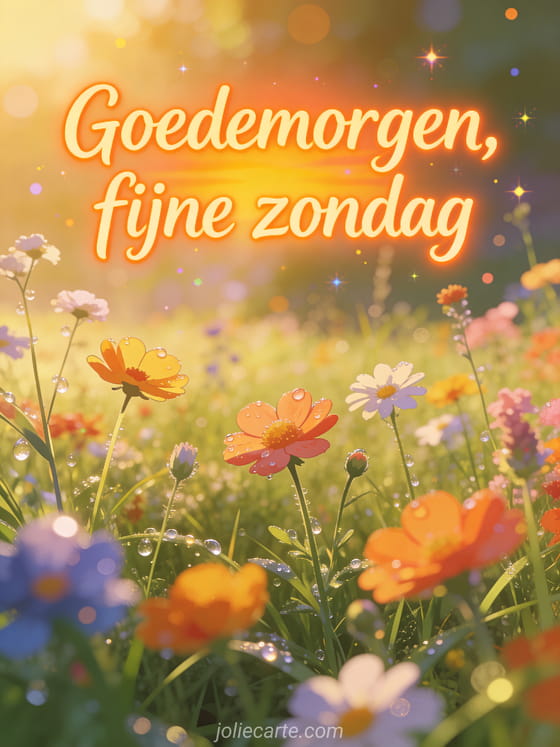 Deel goedemorgen fijne zondag met een weide vol wilde bloemen tijdens het gouden uur, met ochtenddauw die schittert in de warme zonsopgang. Houd de zondagse sfeer vast met fijne zondag fijne dag, grappige gif fijne zondag of fijne zondagavond.