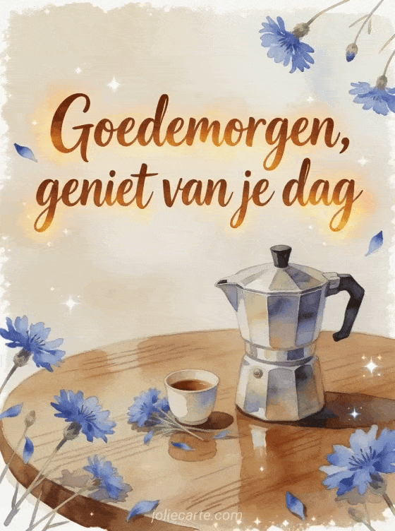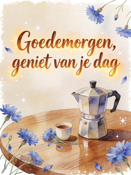 Begin de dag met warme aquareltekst, een koffiekan, een klein kopje en blauwe korenbloemen op een gepolijste houten tafel. Ontdek ook een kaart voor goedemorgen koffie kusjes gif, een kaart voor goedemorgen koffie hart gif of een kaart voor goedemorgen koffie bericht.