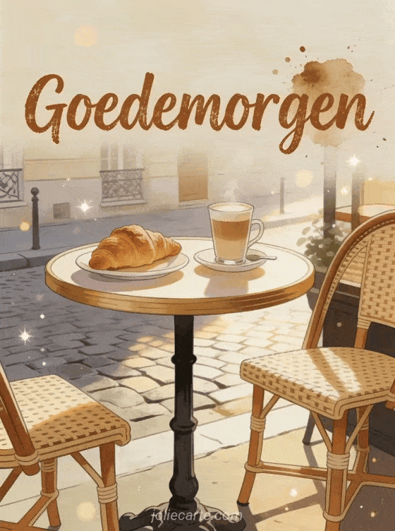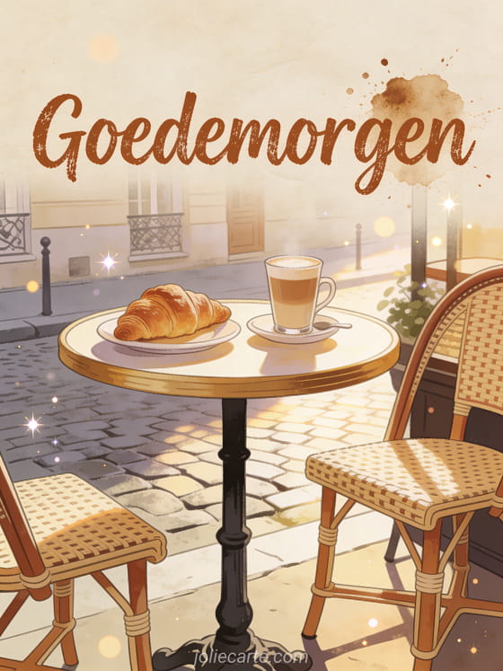 Stuur een charmante goedemorgen kaart met een sfeervol Frans caféterras met croissants en café au lait op een klein rond tafeltje, verlicht door ochtendlicht in een Parijse straat. Ontdek ook een goede morgen gifs kaart of een goede morgen lieverd kaart of een bericht goede morgen kaart.