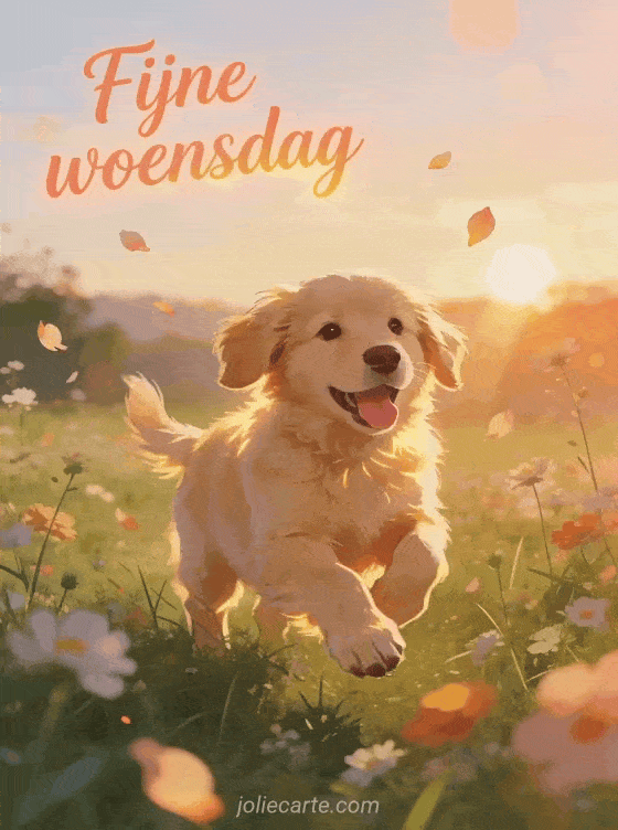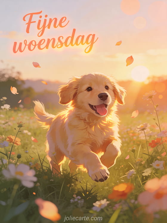 Stuur een vrolijke woensdaggroet met een pluizige golden retriever puppy die bij zonsopkomst in een weide vol wilde bloemen speelt. Ontdek ook fijne woensdag foto's, fijne woensdag boeket of fijne woensdag kusjes geanimeerde gif.