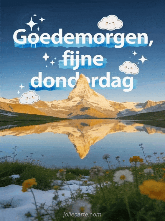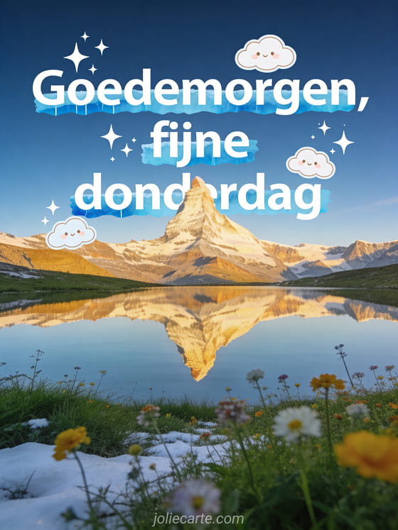 Deel een realistische kaart voor goedemorgen fijne donderdag met heldere witte letters, lieve wolken, fonkelende sterren, de majestueuze Matterhorn weerspiegeld in een kalm Alpenmeer en bloemenweiden in gouden ochtendlicht. Bekijk ook fijne donderdag fijne dag, deze fijne donderdag afbeeldingen of deze mooie afbeelding fijne donderdag.