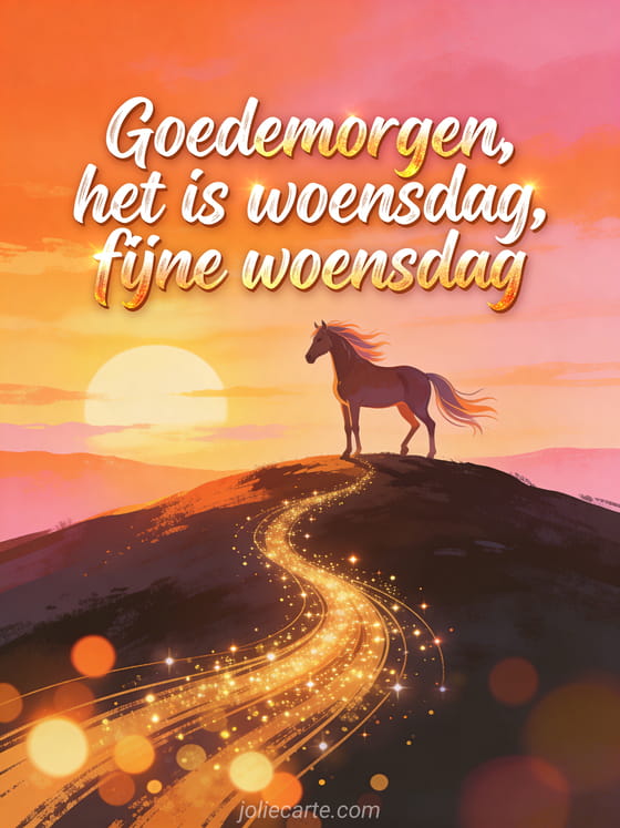 Deel een opgewekte woensdaggroet met warme penseelletters, een heldere zonsopgangshemel, een paard, glinsterende sporen, helder bokeh en levendige kleuren. Bekijk ook geanimeerde fijne woensdag, fijne woensdag berg of geanimeerde fijne woensdag afbeeldingen.