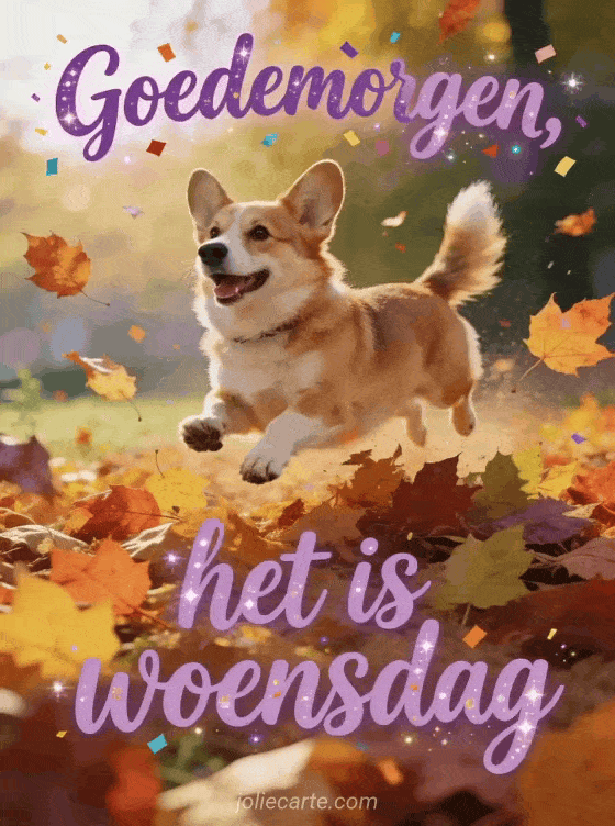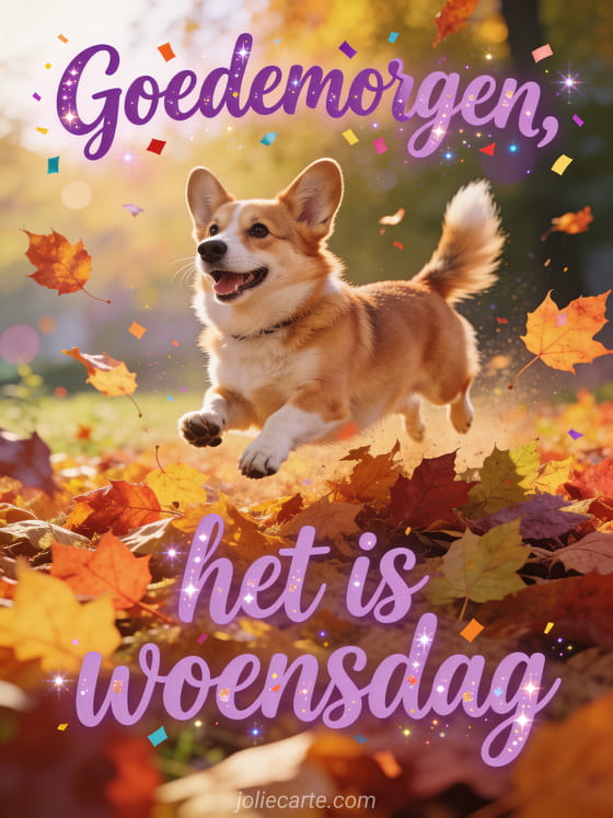 Stuur een vrolijke goedemorgen woensdag groet met een blije corgi die door kleurrijke herfstbladeren springt in warm licht. Ontdek ook een goedemorgen fijne woensdag afbeelding, een fijne woensdag bloemen gifs of een goedemorgen goedemorgen fijne woensdag afbeelding.