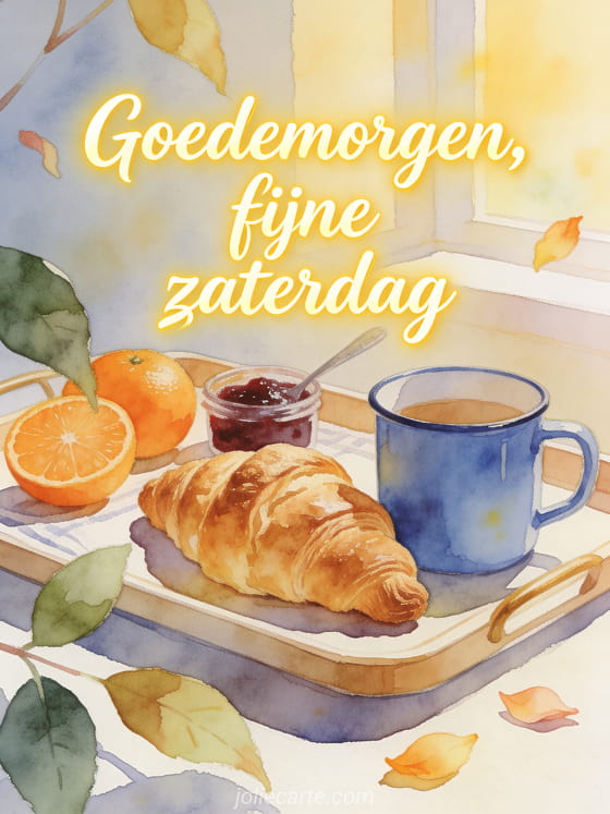Deel een vrolijke zaterdagochtendgroet met een luchtige croissant, een blauwe emaille mok, sinaasappels en jam op een ontbijtblad in aquarel. Ontdek ook fijne zaterdag gifs, fijne zaterdag citaat afbeelding of heel mooie fijne zaterdag afbeelding.