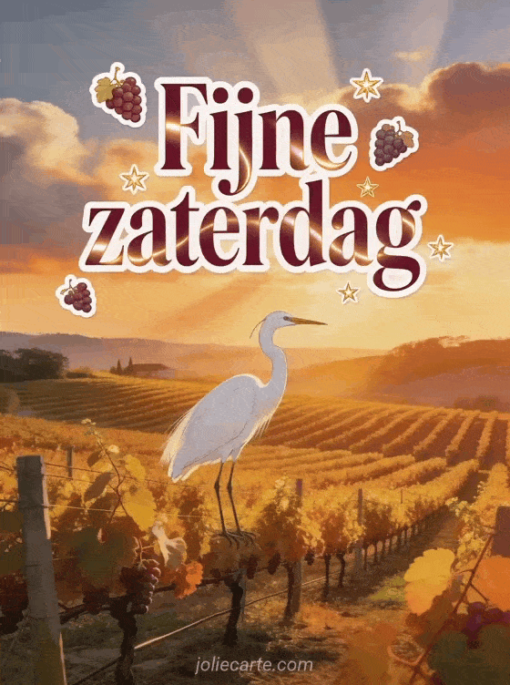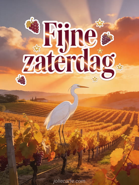 Stuur een warme fijne zaterdag met een wijngaard in Napa Valley, gouden rijen wijnstokken, druivenstickers en een majestueuze witte reiger die landt in oranje zonsondergangslicht. Ontdek ook fijne zaterdag vrienden gifs, vriendschap fijne zaterdag fijn weekend of goedemorgen fijne zaterdag kusjes.