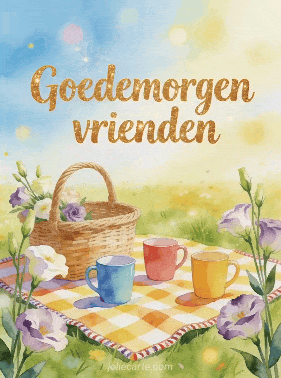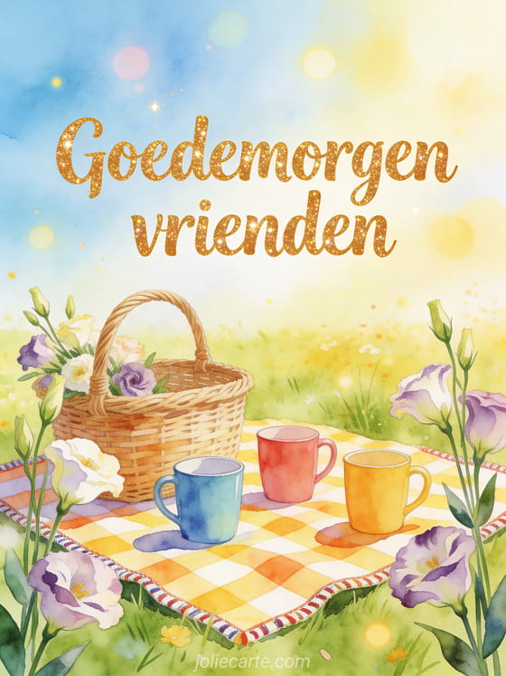 Stuur goedemorgen kaarten voor vrienden met krachtige vrolijke aquarelletters, drie kleurrijke mokken, een gevlochten picknickmand en lisianthus rond een helder geruit tafelkleed. Ontdek ook goedemorgen bericht afbeelding, goedemorgen bericht voor mijn vrouw of mooi goedemorgen bericht.