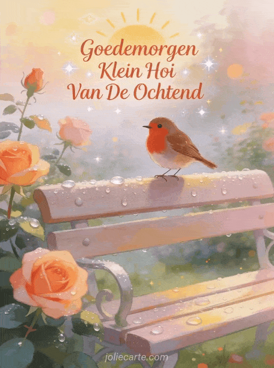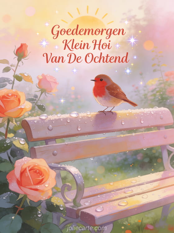 Stuur een pittoreske ochtendgroet met een roodborstje op een dauwige tuinbank in een mistige rozentuin. Bekijk ook een een klein hoi of een hoi kleine papegaai.