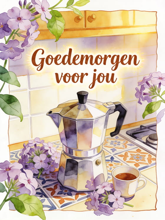 Deel een warme goedemorgen koffiekaart met een gepolijste mokkapot, een klein kopje, vlambloemen en betegelde keukenpatronen in goud licht. Je kunt ook een goedemorgen koffie bloemen afbeelding, een afbeelding goedemorgen koffie of een goedemorgen met koffie geanimeerde gif sturen.