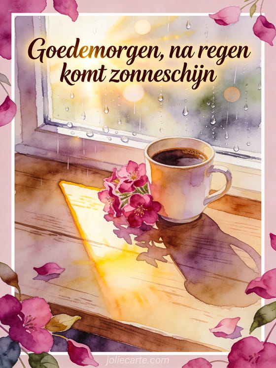 Deel een hoopvolle ochtendgedachte met een kopje koffie bij een raam met regendruppels, fuchsia bloemen en een warme zonnestraal over de tafel. Je kunt ook een sprankelende goedemorgen koffie gif, koffie goedemorgen mijn liefste of ochtendkoffie goedemorgen sturen.