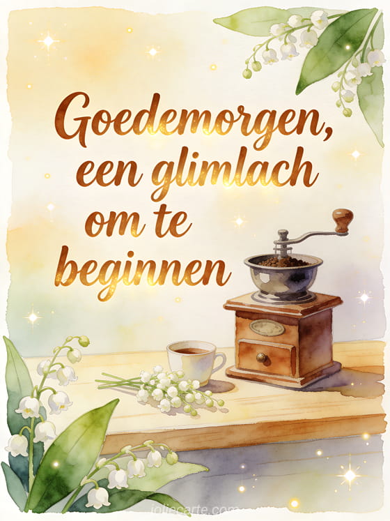 Begin de dag met een glimlach dankzij een vintage koffiemolen, een klein kopje en takjes lelietje-van-dalen op een helder houten aanrecht. Je kunt ook een goedemorgen koffie afbeelding, een goedemorgen koffie bloemen afbeelding of een afbeelding goedemorgen koffie sturen.