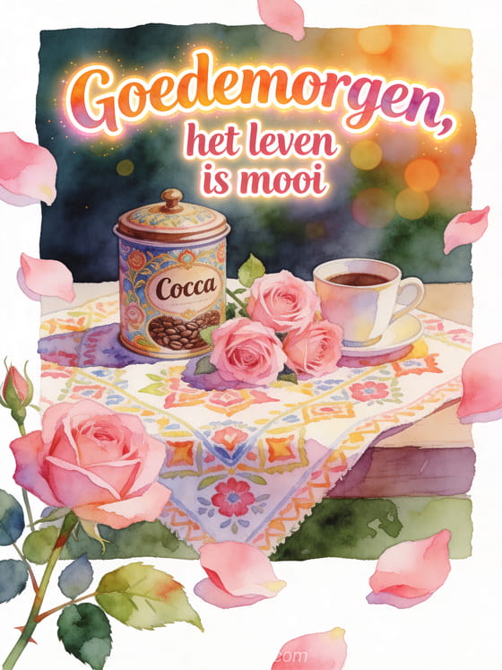 Deel een heldere ochtendherinnering dat het leven mooi is, met een decoratief koffieblik, een kopje en roze rozen op een vrolijk patroonkleed. Je kunt ook goedemorgen koffie gifs, goedemorgen koffie tederheid of goedemorgen koffie citaat sturen.
