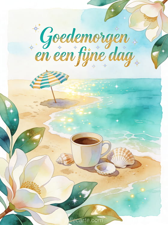 Begin de dag met blauwgroene en gouden letters, magnoliablaadjes over de rand en een kopje koffie naast schelpen bij een gestreepte parasol. Je kunt ook goedemorgen koffie kusjes, goedemorgen goede koffie foto of goedemorgen de koffie is geserveerd sturen.