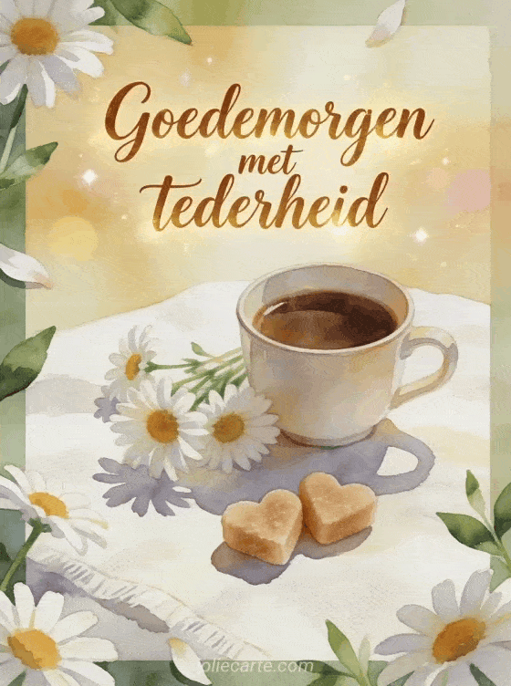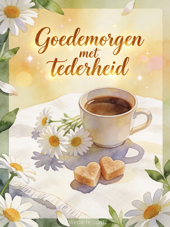 Deel een zachte ochtendwens met kastanjebruine aquareltekst, een kopje koffie, margrieten, hartvormige suikerklontjes, licht linnen en sprankelende bokeh. Ontdek ook een kaart voor goedemorgen koffie citaat, een kaart voor sprankelende goedemorgen koffie gif of een kaart voor koffie goedemorgen mijn liefste.