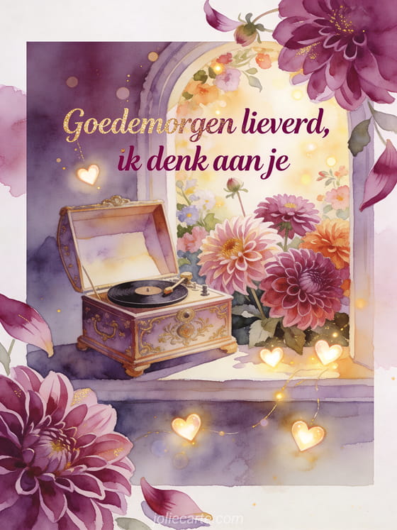 Stuur een romantische kaart met een geopende sierlijke muziekdoos naast rijke dahlia's en gloeiende hartvormige lampjes. Ontdek ook een goedemorgen bericht voor zijn vriendin, een ontroerend goedemorgen bericht of een ochtend goedemorgen bericht.