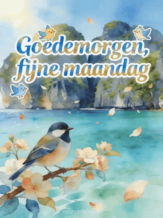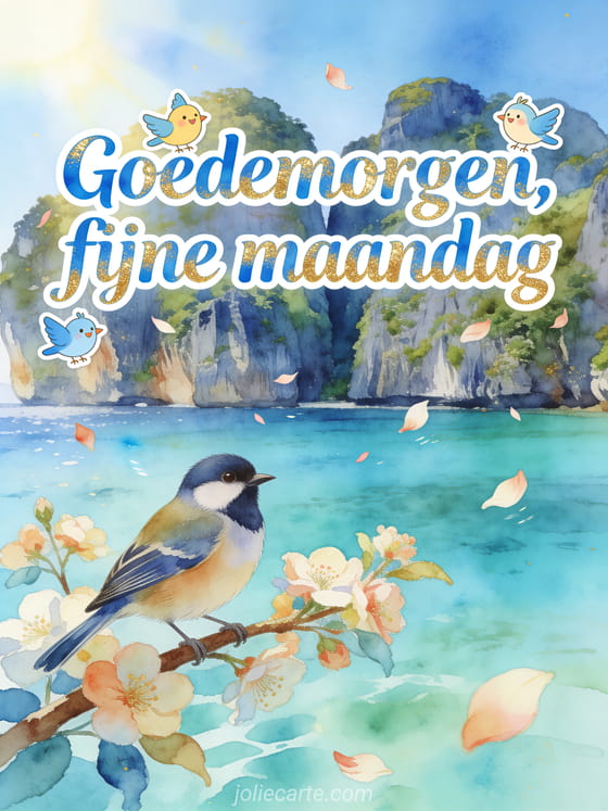 Stuur een lichtgevende groet voor goedemorgen en fijne maandag met blauwe aquarelletters, gouden accenten, vrolijke vogels, zwevende bloemblaadjes, turquoise water van Phi Phi en een goudvink op een bloeiende tak. Bekijk ook deze goedemorgen fijne maandag koffie, deze fijne maandag fijne week gif of deze fijne maandag koffie afbeelding.