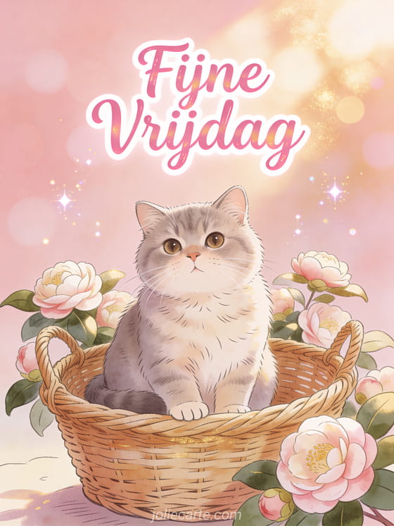 Stuur een charmante vrijdaggroet met een pluizige Britse korthaar kat in een vintage rieten mand omgeven door camelia bloemen. Bekijk ook een vrijdag afbeelding goedemorgen of een vrijdag hallo vrijdag.