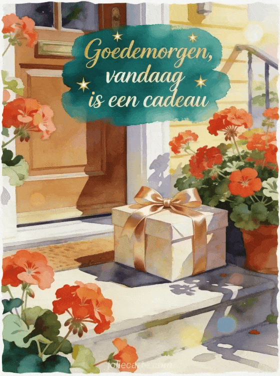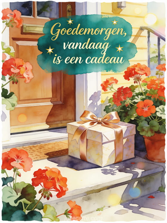 Stuur een feestelijke goedemorgen kaart met een ingepakt cadeau met satijnen lint naast heldere geraniums op een zonnige drempel. Ontdek ook goedemorgen kaarten, een eenvoudig goedemorgen bericht of een goedemorgen lieverd bericht.