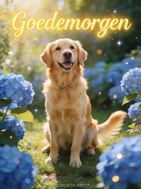 Deel een heldere goedemorgengroet met een blije golden retriever in een zonnige tuin vol blauwe hortensia's. Ontdek ook fijne vrijdag fijne dag afbeeldingen, een mooie afbeelding van fijne vrijdag of een fijne vrijdag zon gif.