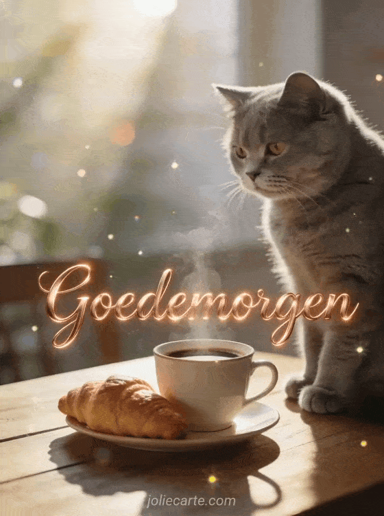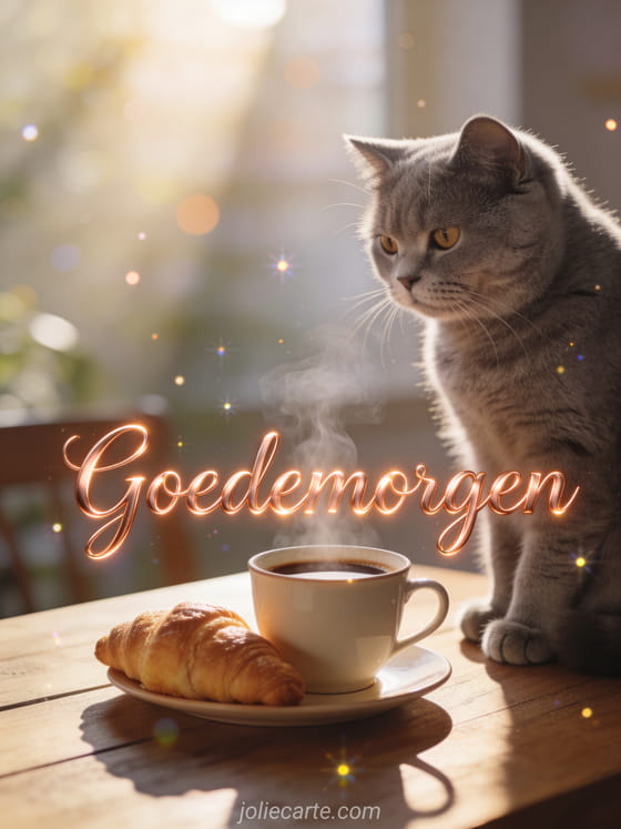 Deel een warme goedemorgengroet met koperkleurige letters, een schattige grijze Britse korthaar kat naast een dampende kop koffie op een houten tafel, ochtendlicht en croissants. Ontdek ook een kaart voor fijne vrijdag ochtend koffie, een vrijdag goedemorgen humorkaart of een goedemorgen vrijdag landschapskaart.