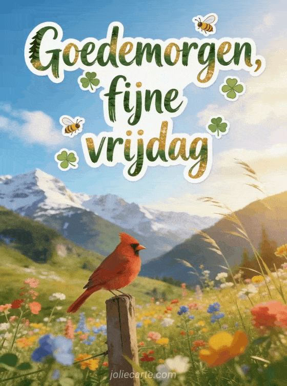 Stuur een heldere vrijdagmorgengroet met een Alpenvallei vol wilde bloemen, besneeuwde toppen, gouden licht en een rode kardinaal op een houten paal. Ontdek ook fijne vrijdag Kerst, fijne vrijdag virtuele kaarten of fijne vrijdag dieren.