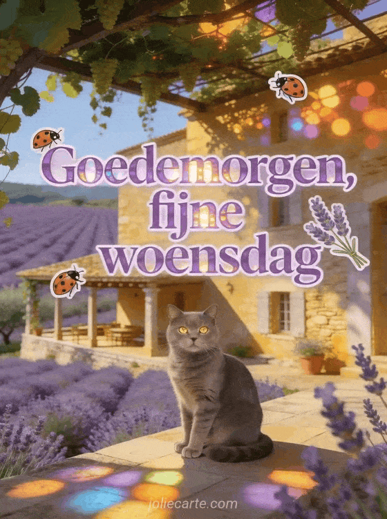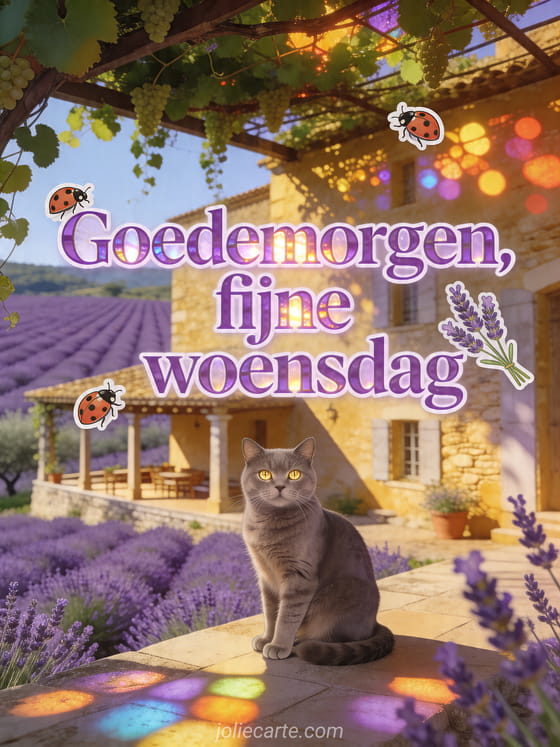 Deel een mooie woensdagochtendgroet met lavendelvelden, een Provençaalse boerderij en een elegante Chartreux kat. Bekijk ook picmix fijne woensdag afbeeldingen, geanimeerde gif fijne woensdag afbeelding en tederheid afbeelding fijne woensdag kusjes.