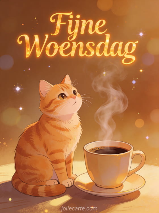Stuur een gezellige goedemorgen woensdag kat groet via deze gratis wenskaart. Een schattige oranje tijgerkat zittend naast een dampende koffiekop, knus ochtend vibes met warme karamel tinten, uitnodigende sfeer met stoom die gracieusement opstijgt. Bekijk ook een fijne woensdag mooie afbeelding of een fijne woensdag.