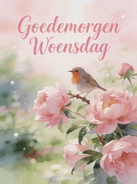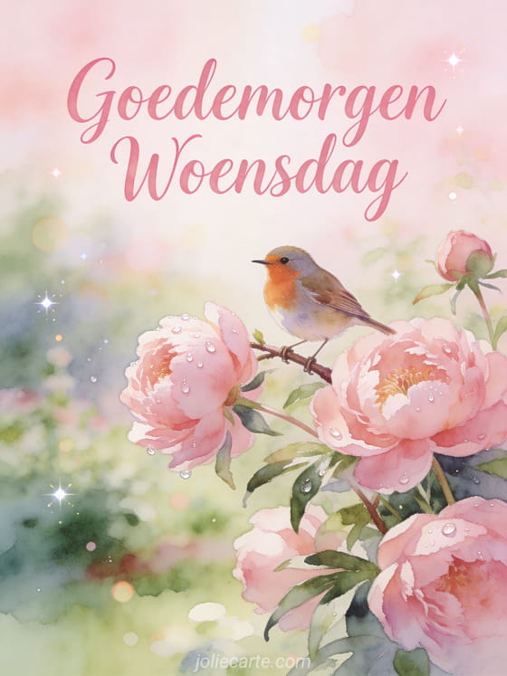 Stuur een lenteachtige goedemorgengroet voor woensdag met een klein roodborstje op een tak van bloeiende roze pioenrozen. Bekijk ook een grappige afbeelding fijne woensdag of een afbeelding met fijne woensdag.