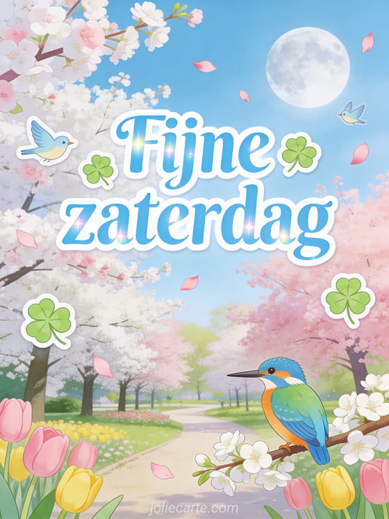 Verstuur goedemorgen zaterdag afbeelding met lichtgevende hemelsblauwe letters, klavertjesvier, vrolijke vogels en een lentepark vol kersenbloesem en tulpen. Deel een frisse weekendwens en ontdek ook de zaterdaggroet, romantische fijne zaterdag gif of fijne zaterdag fijn weekend.