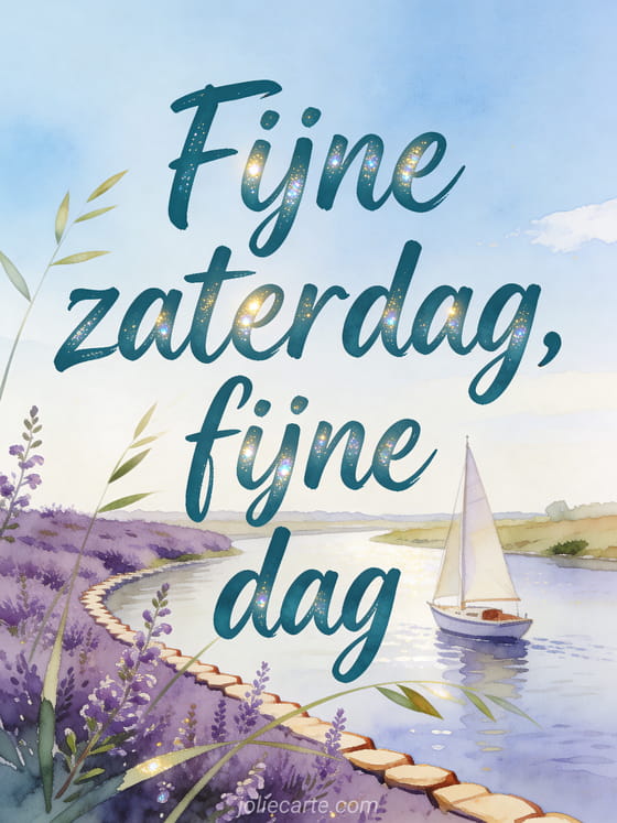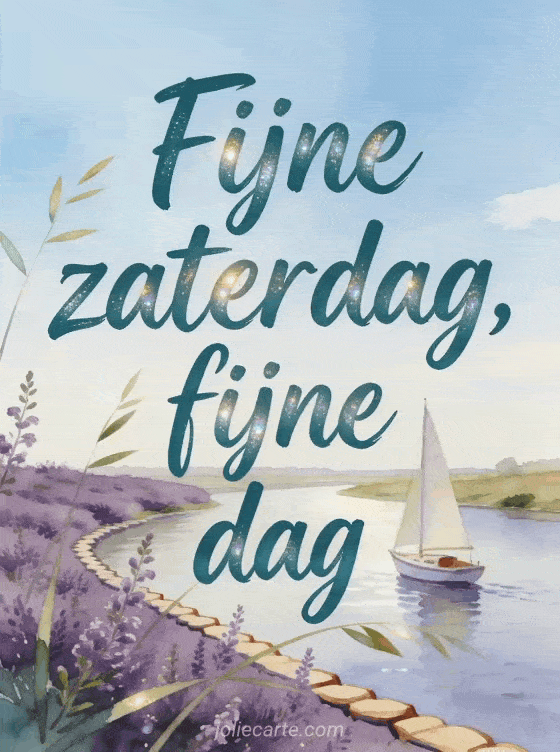 Deel een goedemorgen zaterdag afbeelding met diep teal handschrift, een kleine zeilboot bij de rivieroever en paarse heidetakjes over de rand. Je kunt ook fijne zaterdag virtuele kaarten, fijne zaterdag dikke kus gif of een gratis goedemorgen zaterdag afbeelding sturen.