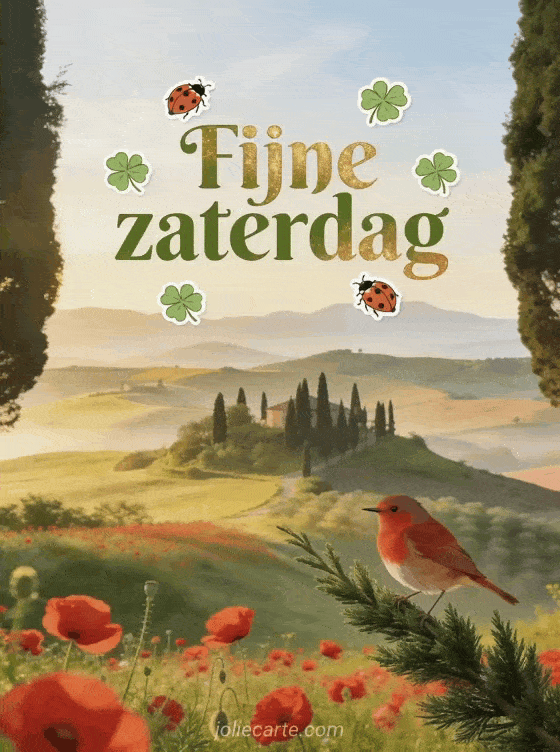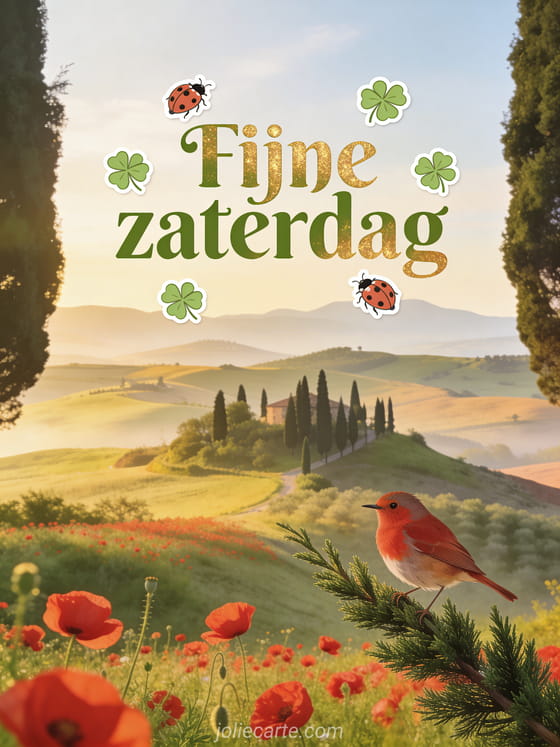 Deel een vrolijke kaart voor fijne zaterdag met olijfgroene letters, gouden accenten, lieveheersbeestjes, geluksklavers, glooiende Toscaanse heuvels, rode klaprozen, slanke cipressen en een roodborstje op de voorgrond. Bekijk ook zaterdag kusjes gifs, mooie zaterdag fijn weekend of deze fijne zaterdag mooie afbeeldingen.