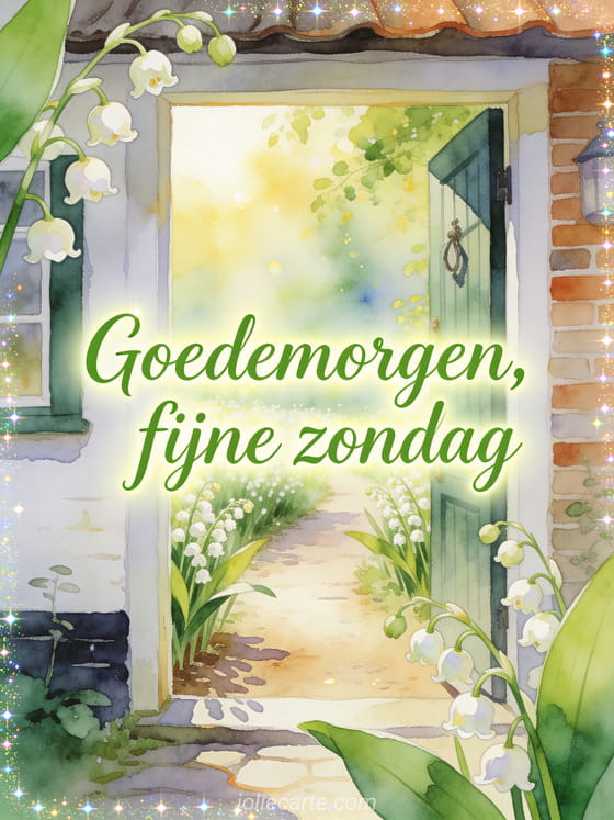 Wens een heldere zondagochtend met een huisdeur die opent naar een pad met lelietjes-van-dalen en fris plattelandslicht. Bekijk ook hele fijne zondag afbeeldingen, fijne zondag vrienden afbeeldingen of een fijne zondag boeket bloemen afbeelding.