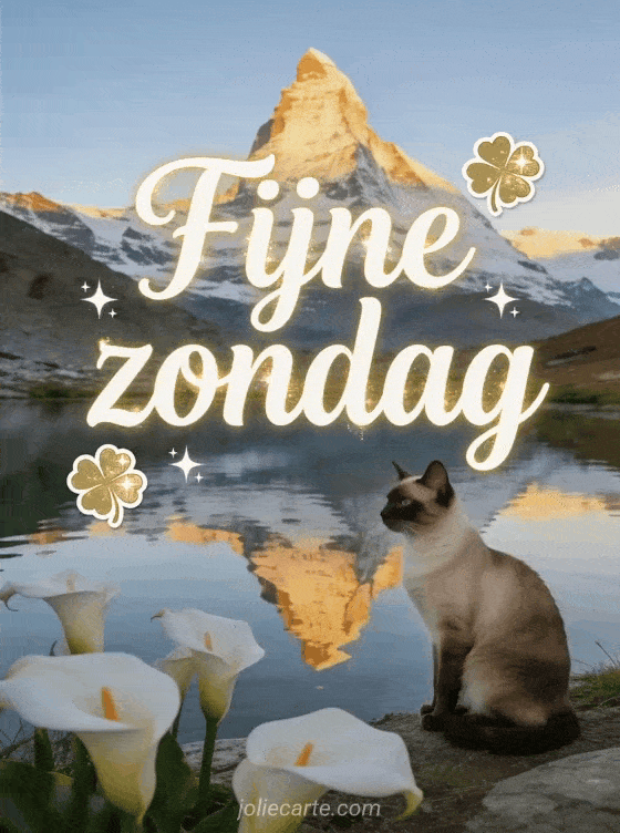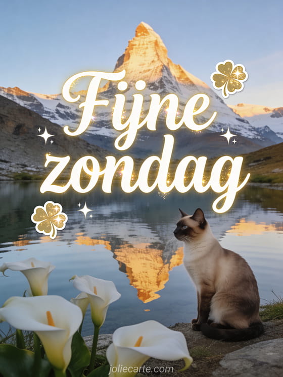 Stuur een serene zondagkaart met crèmekleurige kalligrafie, gouden reflecties, klavertjes en heldere sterren, de Matterhorn weerspiegeld in een kristalhelder alpien meer, een sierlijke Siamese kat en witte aronskelken. Ontdek ook fijne zonnige zondag gif, afbeelding van fijne zondag of fijne zondag met familie.