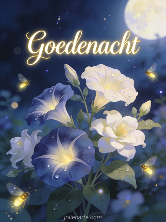 Stuur een prachtige goedenacht met bloemen groet via deze gratis wenskaart. Mooie nachtbloeiende bloemen zoals maanbloemen en jasmijn met dauwdruppels, omgeven door gloeiende vuurvliegjes in een serene nachtelijke tuin. Bekijk ook een goedenacht slaap lekker of een goedenacht wensen in afbeeldingen.