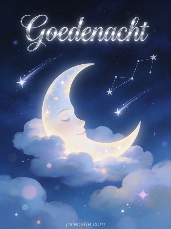 Stuur een prachtige goedenacht groet in afbeelding via deze gratis wenskaart. Een mooie wassende maan met een zacht gezicht omgeven door wolken en sterrenbeelden in een diepblauwe fluweelhemel. Bekijk ook een hond goedenavond en goedenacht of een vlinder goedenacht.