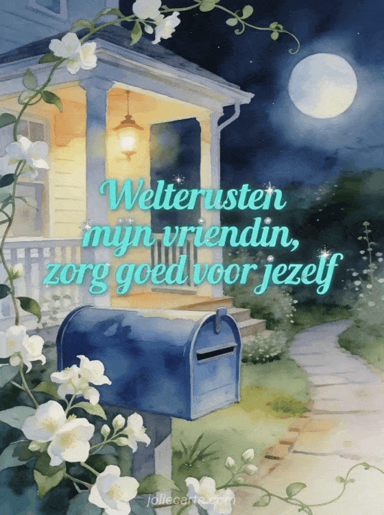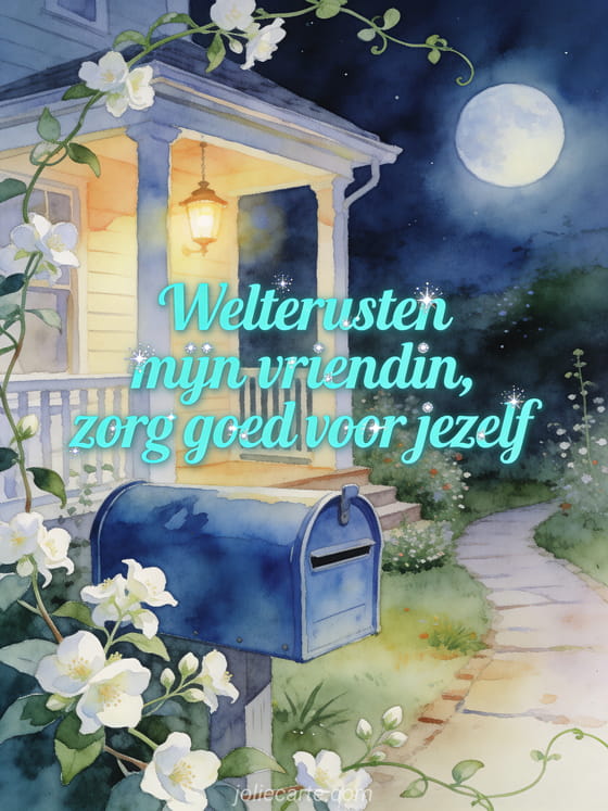 Stuur een zacht goedenachtbericht aan een vriendin met een blauwe brievenbus, een maanverlicht tuinpad, warm verandlicht en jasmijnbloemen. Bekijk ook een klein goedenachtbericht, romantisch welterusten bericht of bericht om een vriendin welterusten te wensen.