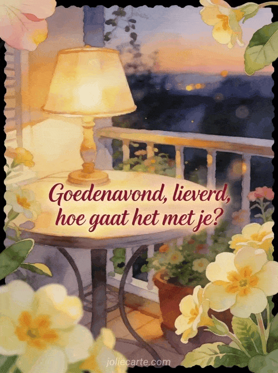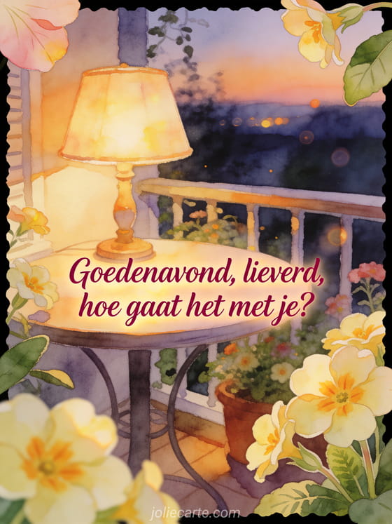 Stuur een zorgzame avondboodschap met donkerroze schrift, primula's, een warme tafellamp en een gezellige balkontuin in de schemering. Ontdek ook een hallo hoe gaat het met je vandaag, een gaat het goed mijn lief kaart of een hoe gaat het mijn lief sms groet.