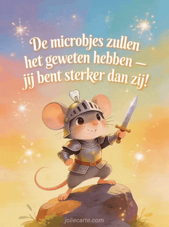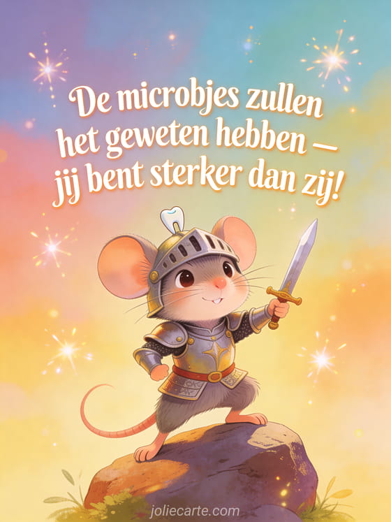Stuur een grappig beterschap bericht met dit moedige muisje in ridderrustingringen dat zegt dat de microben het geweten hebben. Bekijk ook grappige tekst beterschap humor of grappig beterschap humor.