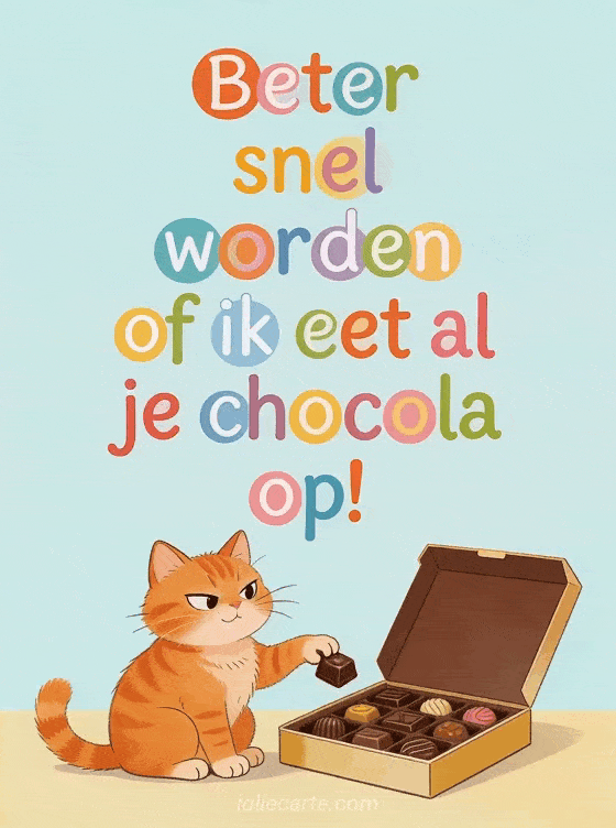 Stuur een grappige beterschapskaart met een schalkse rode kat naast een doos chocola. Vrolijk je zieke vriend of vriendin op met humor.