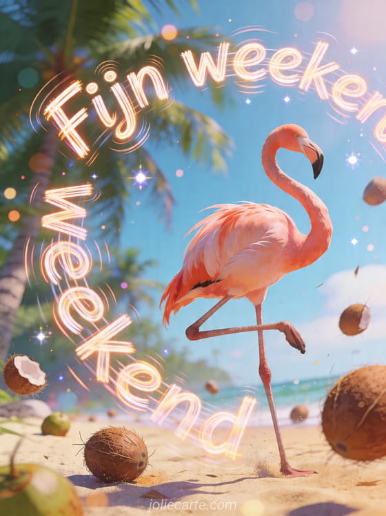 Laat iemand lachen met deze hilarische weekendkaart waarop een onhandige flamingo op één poot een balletpose probeert op een chaotisch tropisch strand met rollende kokosnoten. Ontdek ook ik wens jullie een fijn weekend, fijn weekend voor iedereen of grappig fijn weekend.