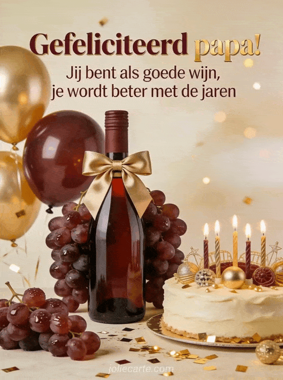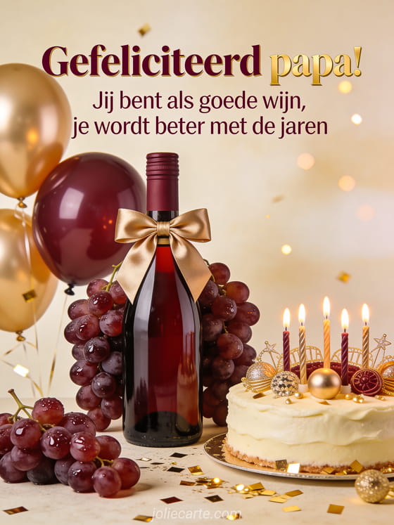 Stuur papa een elegante en grappige verjaardagsgroet met de boodschap dat hij als goede wijn beter wordt met de jaren. Bekijk ook grappige tekst verjaardag papa of tekst gefeliciteerd papa.