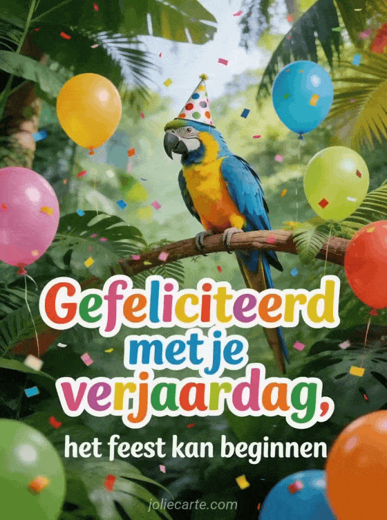 Een blauwe en gele ara papegaai met feestmuts met stippen zit op een tropische tak omringd door kleurrijke ballonnen in een weelderige jungle. Bekijk ook gelukkige verjaardag man of citaat verjaardag man.
