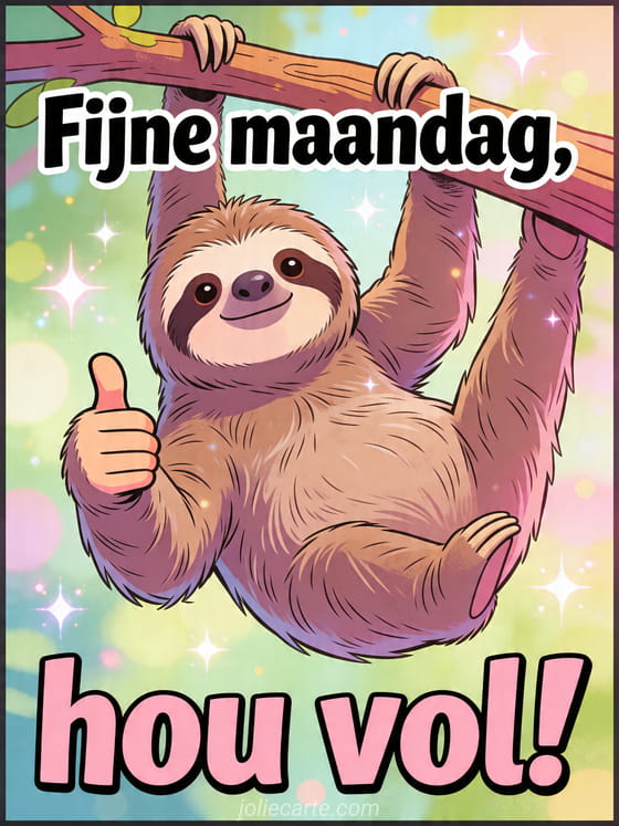 Stuur een Fijne maandag kaart met een grappige luiaard die een duim omhoog geeft voor extra moed en glimlachen. Bekijk ook maandag goedemorgen, fijne maandag fijne week grappig en goedemorgen fijne maandag.