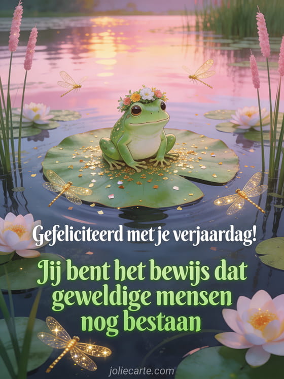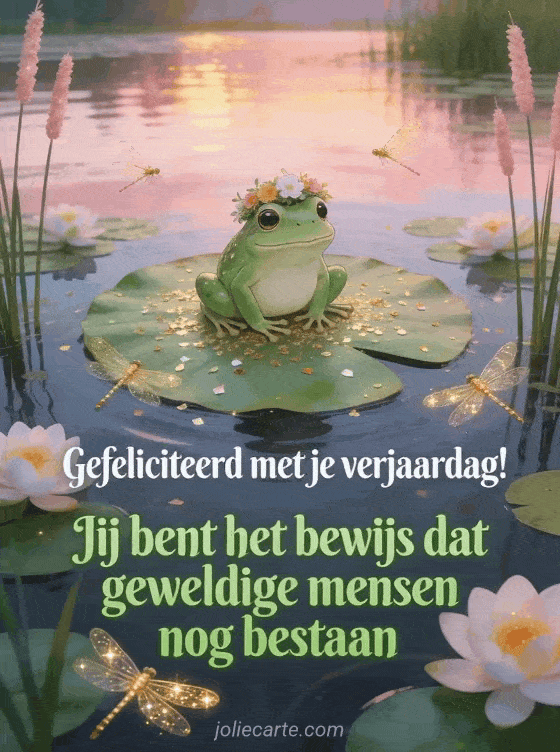 Deel een grappig verjaardagsbericht met een charmante kikker op een reusachtige waterlelie, fonkelende libellen en sprookjesachtige vijversfeer. Bekijk ook man gif verjaardag humor, grappig gefeliciteerd met je verjaardag en verjaardag kat humor.