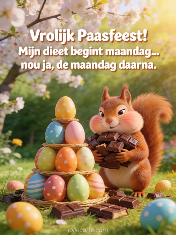 Stuur een humoristische paasfeest-kaart met een rondbolle eekhoorn die chocolade torst en een dieetgrap. Ontdek ook een kat pasen humor of een paasei humor.