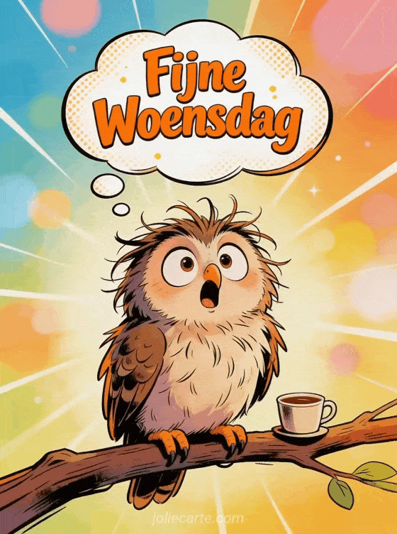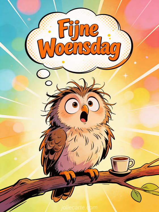 Stuur een grappige fijne woensdag afbeelding via deze gratis wenskaart. Een hilarische pluizige uil met verwarde veren die er verrast uitziet, zittend op een tak met een mini koffiekopje, heldere vrolijke ochtendkleuren, grappige sfeer met speelse lichtstralen. Bekijk ook een afbeelding met fijne woensdag of een gifs fijne zonnige woensdag.