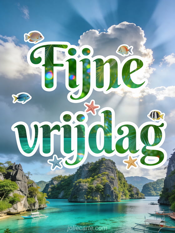 Verstuur een grappige fijne vrijdag humor afbeelding met groene tropische letters, kleine vissen, zeesterren en de verborgen meren van Coron in Palawan. Deel een lichte wens voor het einde van de week en ontdek ook fijne vrijdag hart, goedemorgen mooie dag op vrijdag of grappige goedemorgen vrijdag humor.