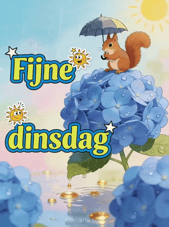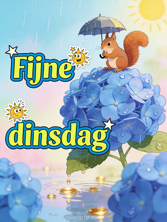 Stuur een grappige dinsdaggroet met citroengele stripletters, speelse zonnetjes en sterren, blauwe hortensia's met dauwdruppels en een eekhoorn op een bloem met een piepkleine paraplu onder stralende zon. Bekijk ook deze fijne dinsdag afbeelding, deze goedemorgen dinsdag kaart of deze gratis fijne dinsdag kusjes afbeelding.